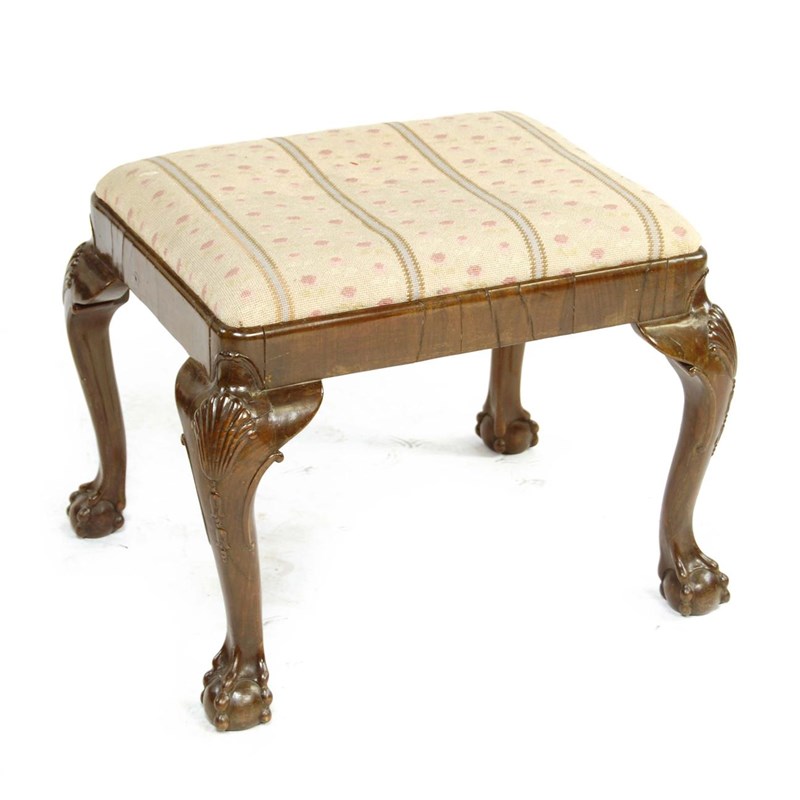 A walnut stool in George II style, the drop-in seat to a plain frieze on husk and shell capped cabriole legs and claw and ball feet, 18.5in (46.8cm) h, 24.25in (61.4cm) w, 19.5in (49.5cm) d. Repairs and replacements.