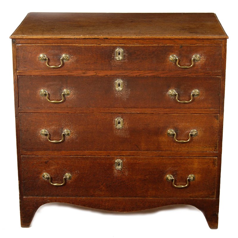 A late George III oak chest, the moulded edge top above four long graduated drawers fitted brass swan neck handles, on bracket feet, 30.5in (77.2cm) h, 31in (78.4cm) w, 18in (45.8cm) d.