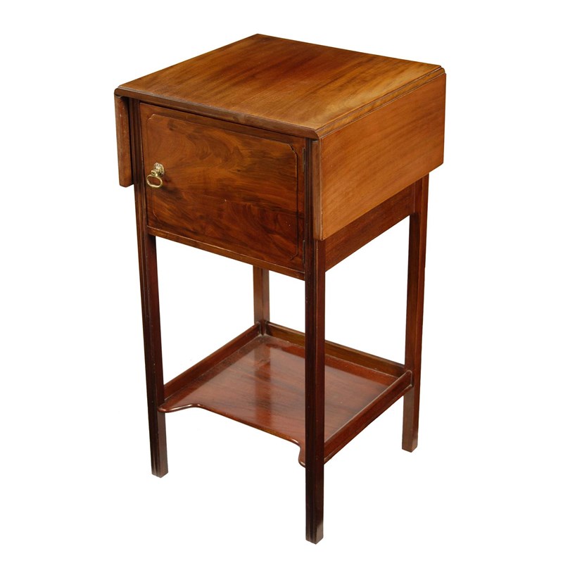A mahogany bedside cupboard in George III style by Heal & Son, the twin flap top above a cupboard door with an applied ivorine plaque inscribed 'HEAL & SON, makers of Bedroom Furniture, LONDON.W', on moulded supports united by an undertier, 29.25in (74.2cm) h, 15.5in (39.3cm) w, 15in (38cm) d.
