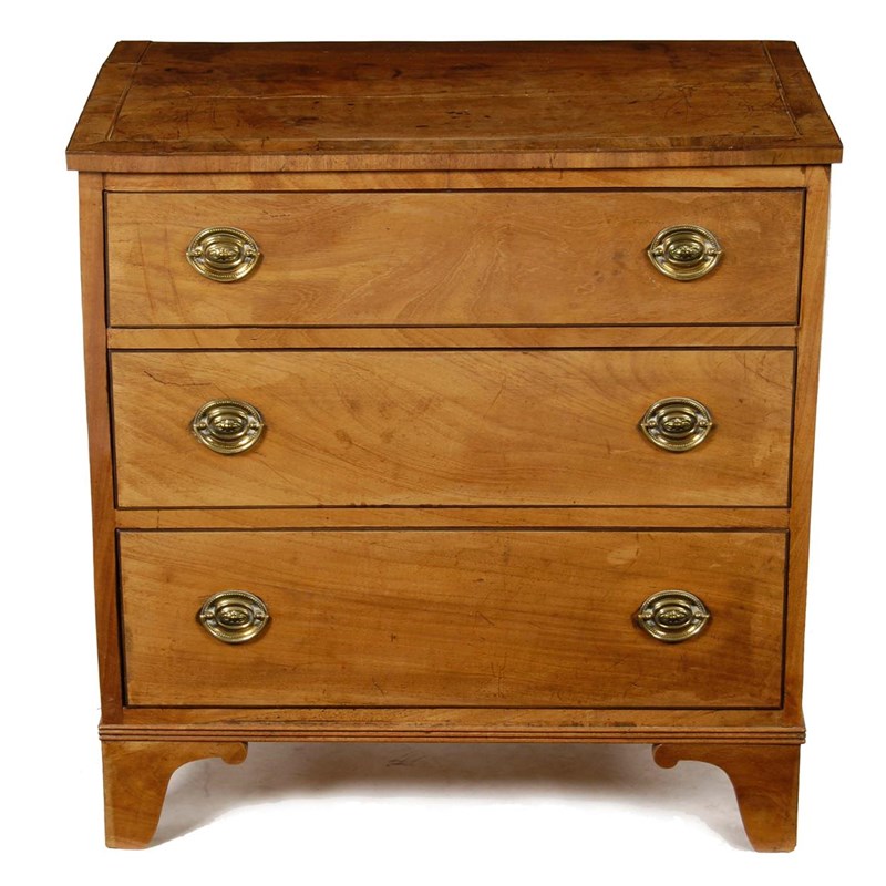 A small mahogany chest, inlaid stringing, the crossbanded top above three graduated drawers and on bracket feet, 27in (68.7cm) h, 26.5in (67.2cm) w, 16.5in (41.9cm) d.