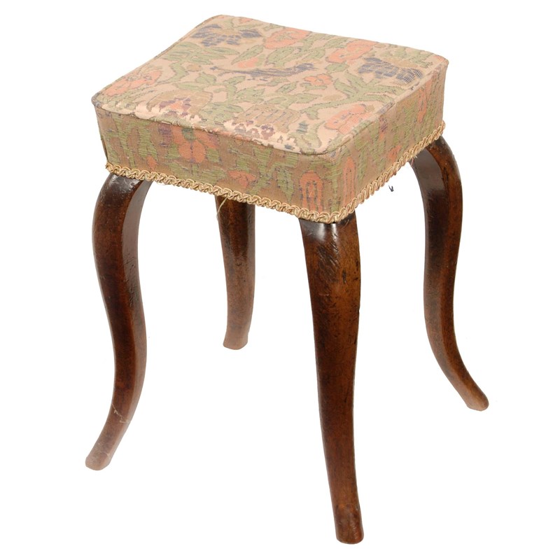 A mahogany stool, the later upholstered seat on cabriole legs, 16.5in (41.7cm) h, 13in (33cm) w, 12.25in (31cm) d.