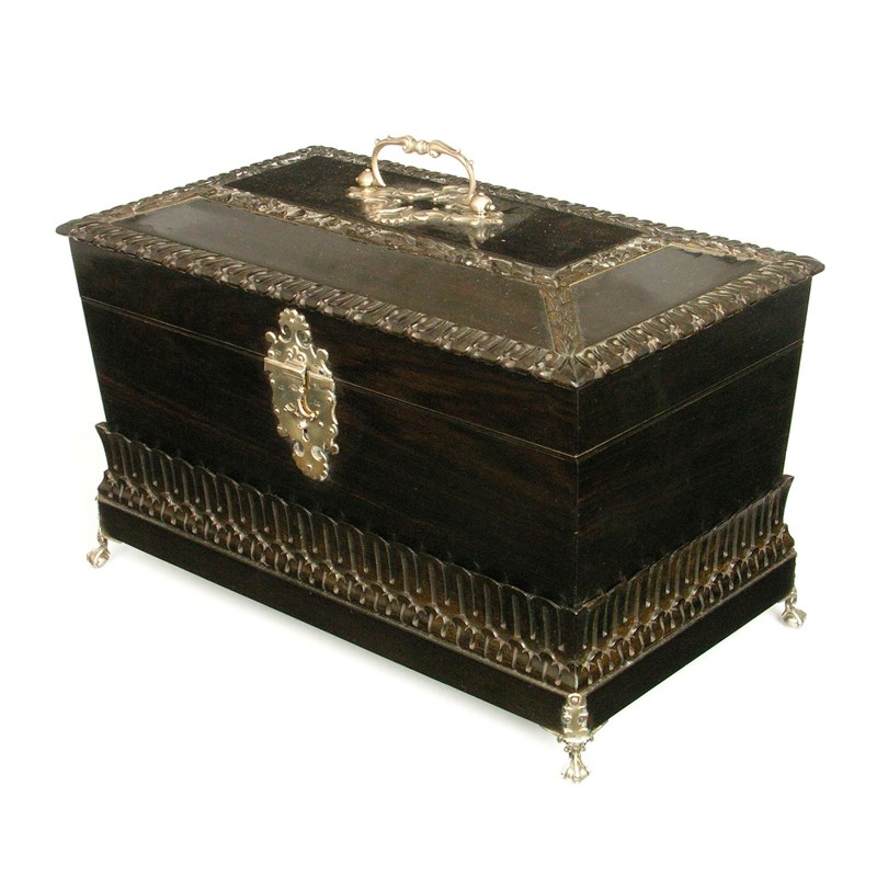 An early 19th century Colonial macassar ebony and silver mounted tea chest, with carved leaf decoration and of sarcophagus shape, the hinged cover with an open plate capped scroll handle, revealing a replaced cut glass bowl, the blue leather surface with a printed paper label;' W. CARTLAND, Travelling & Drefsing Case, DESK AND WORK-BOX Manufacturer, 18 Old Bond Street, Bath.', flanked by a pair of hinged lid canisters, the front with a shaped escutcheon and clasp, raised on claw and ball feet, the mounts marked 'C.N' and a lion passant, mounts possibly later, 8.75in (22cm) h, 13.5in (34.4cm) w.