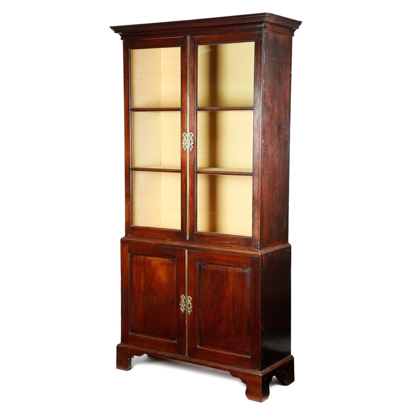 the moulded cornice above a pair of astragal glazed doors enclosing a silk lined interior, with two fixed shelves, above a pair of fielded panel doors, on shaped bracket feet