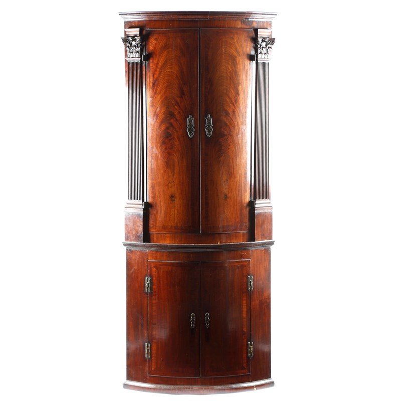 A GEORGE III MAHOGANY BOWFRONT STANDING CORNER CUPBOARD IN THE MANNER OF GILLOWS