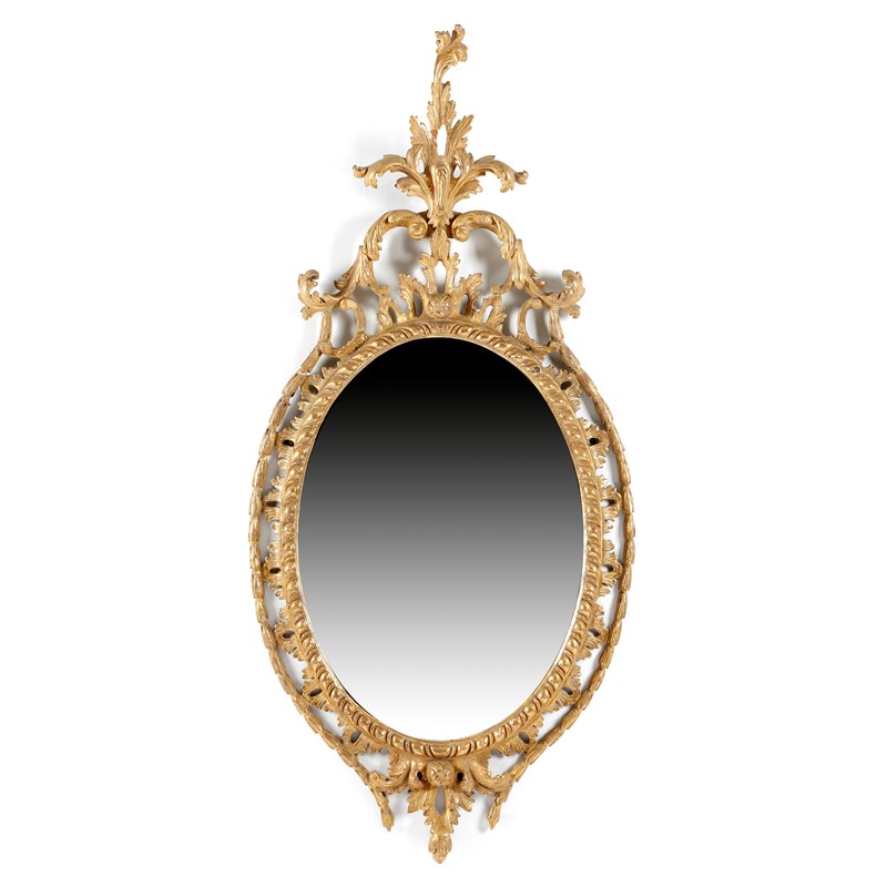 A GEORGE III GILTWOOD WALL MIRROR C.1770 the later oval plate within a gadrooned inner frame and...