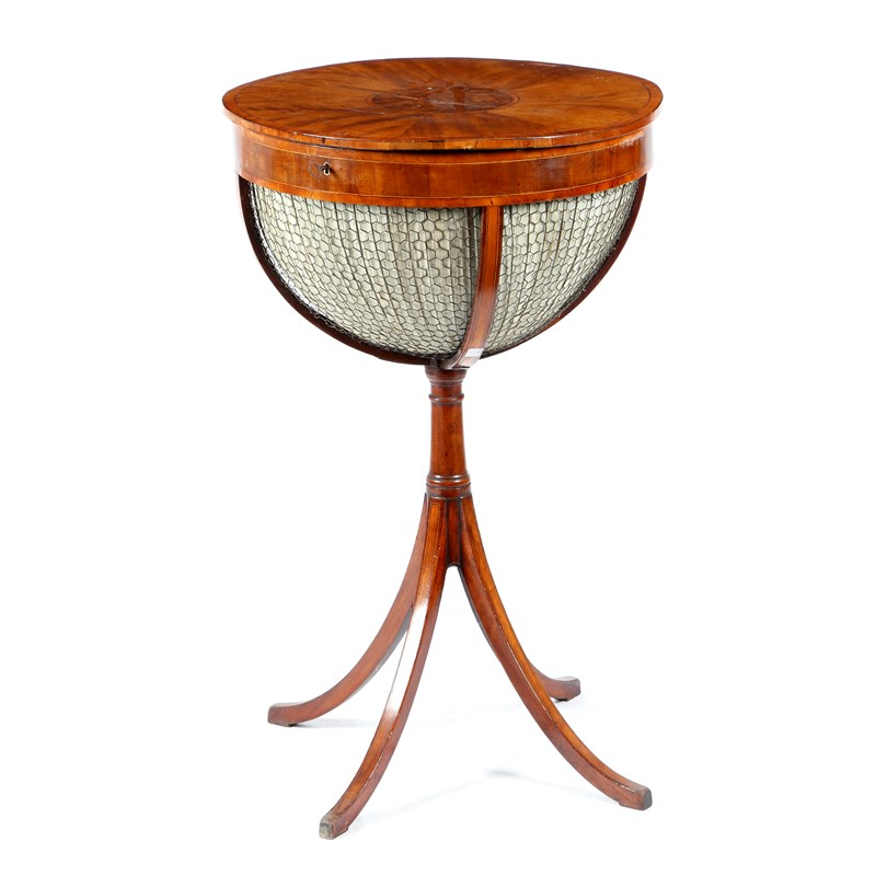 inlaid with stringing and satinwood crossbanding, the circular swivel top centred with a burr yew panel, above a wirework and silk lined basket, on a turned stem and four swept legs