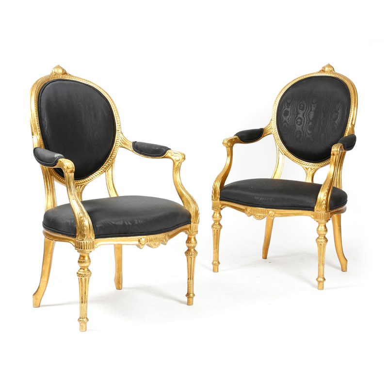 each with an oval padded back within a guilloche carved frame and an urn cresting, upholstered with black watered silk, the arm supports carved with leaves and husks, above a serpentine front seat, with a flowerhead and fluted tablet, on stiff leaf and stop-fluted tapering front legs, re-gilt and restored (2)