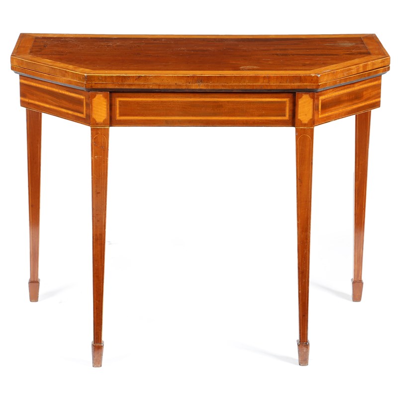 of canted form, the fold-over top banded in rosewood and satinwood, on twin gate supports