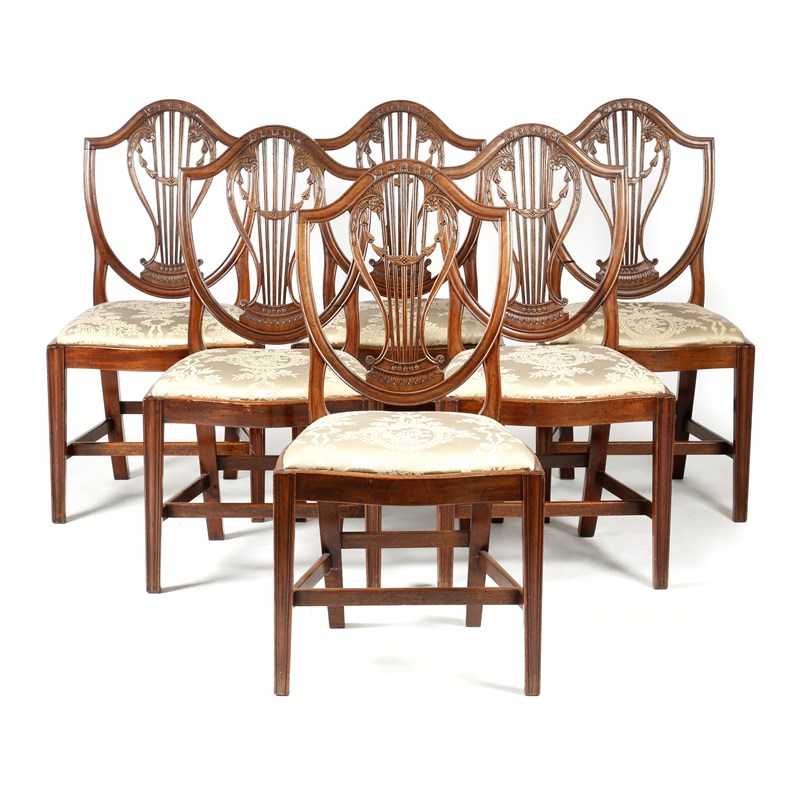 each with a shield back, the channelled outer frame carved with flowerheads, with a lyre shaped splat decorated with laurel swags, flowers and stiff leaves, above a serpentine front drop-in seat, on moulded front legs united by an 'H' stretcher (6)