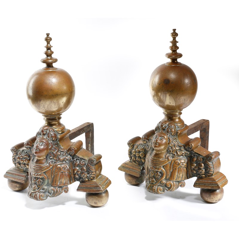 A PAIR OF DUTCH BRASS ANDIRONS 18TH CENTURY each with a turned ball finial