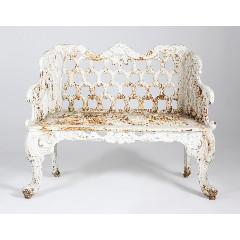 A WHITE PAINTED CAST IRON GARDEN BENCH AFTER A DESIGN BY THE CARRON FOUNDRY