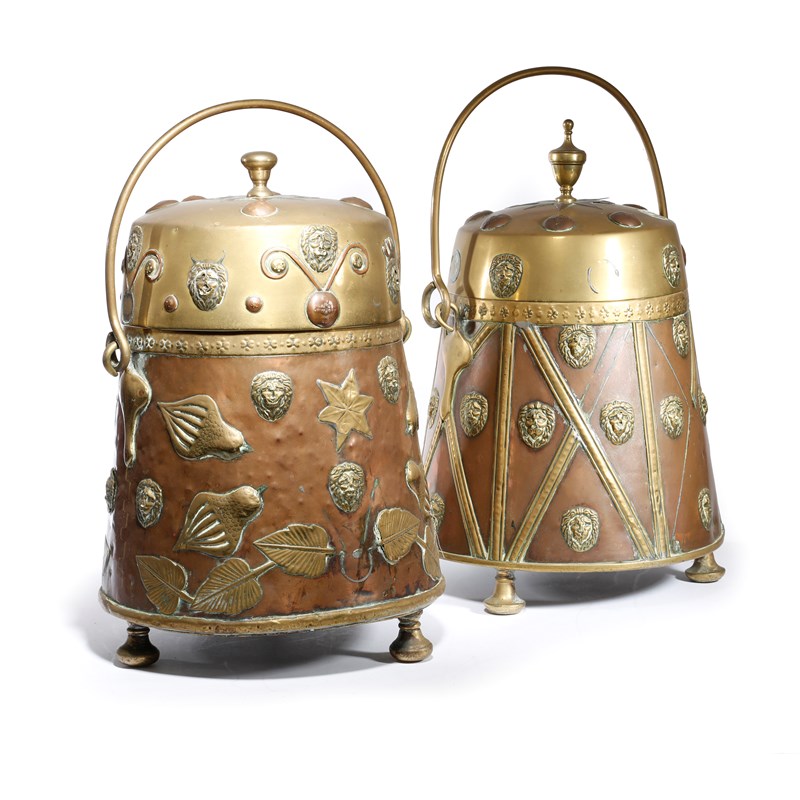 each with a lift-off cover, one with an urn finial, the tapering bodies decorated with lion's masks, one with leaves and fruit, with a swing handle, on tripod feet (2)