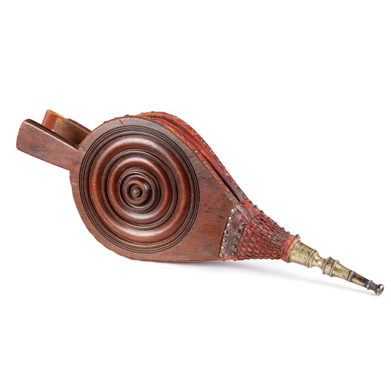 A PAIR OF GEORGE III MAHOGANY BELLOWS LATE 18TH CENTURY one side decorated with a turned rondel