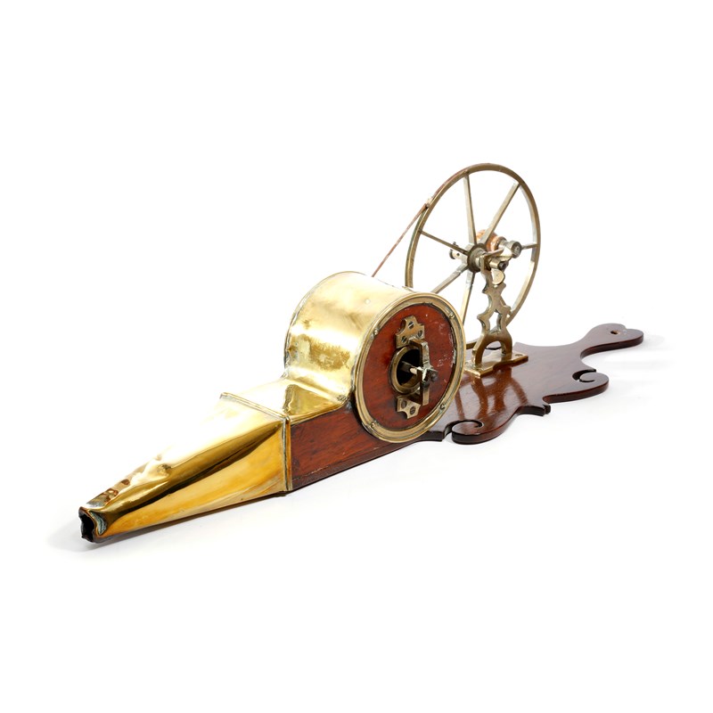 with a seven spoke winding wheel, the open sided cylinder with four blades to a tapering spout, on a fret-frame backplate