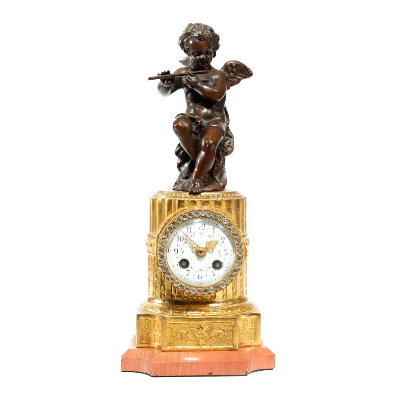 the brass drum eight day movement with a lever escapement and an outside countwheel striking on a bell, the backplate stamped '85958...', the white enamel dial decorated with swags of flowers, with Arabic numerals and pierced gilt hands, the bezel applied with paste faux diamonds, the fluted column case surmounted by a winged cherub playing a flute