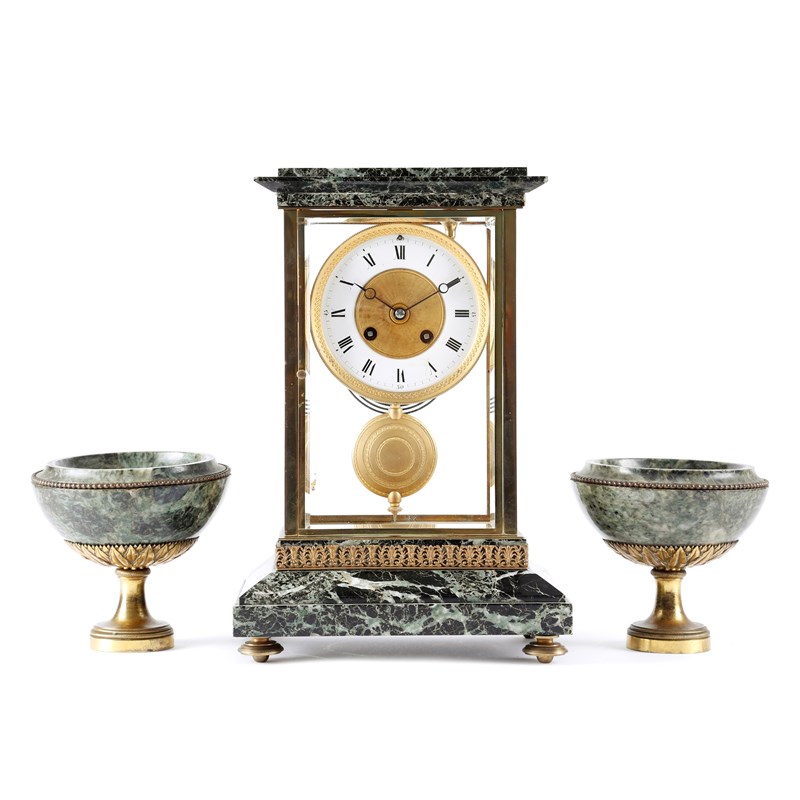 A FRENCH VERDE ANTICO MARBLE FOUR GLASS MANTEL CLOCK GARNITURE