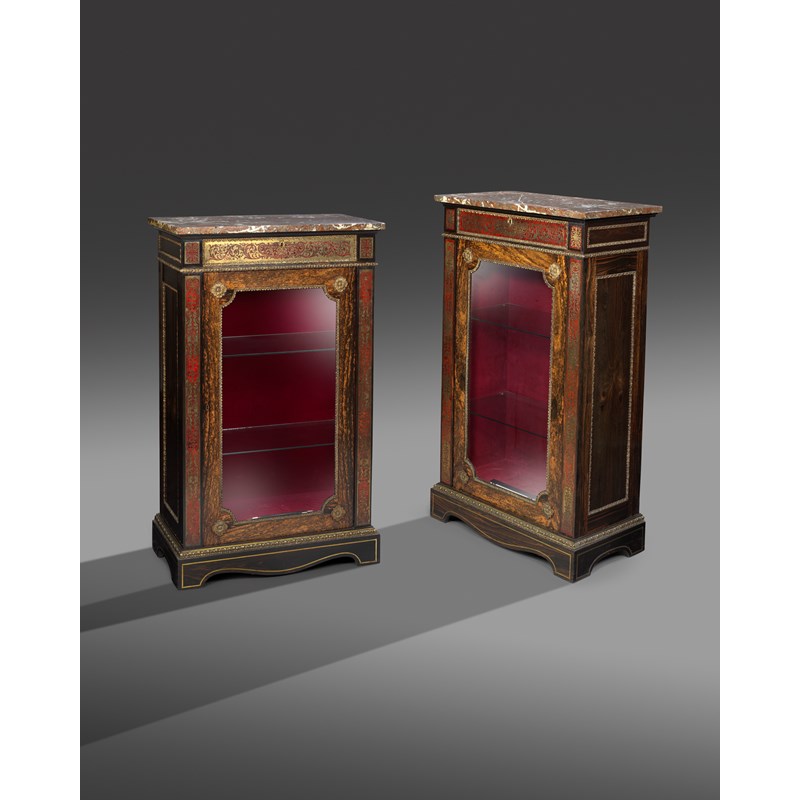 gilt bronze mounted and with panels of engraved cut-brass marquetry of scrolling leaves, flowers and strapwork, on a red tortoiseshell ground, premiere and contre partie, each with a Royal Red marble rectangular top, above a mahogany lined frieze drawer and a glazed door with corner rosettes enclosing two later glass shelves, with lights (2)