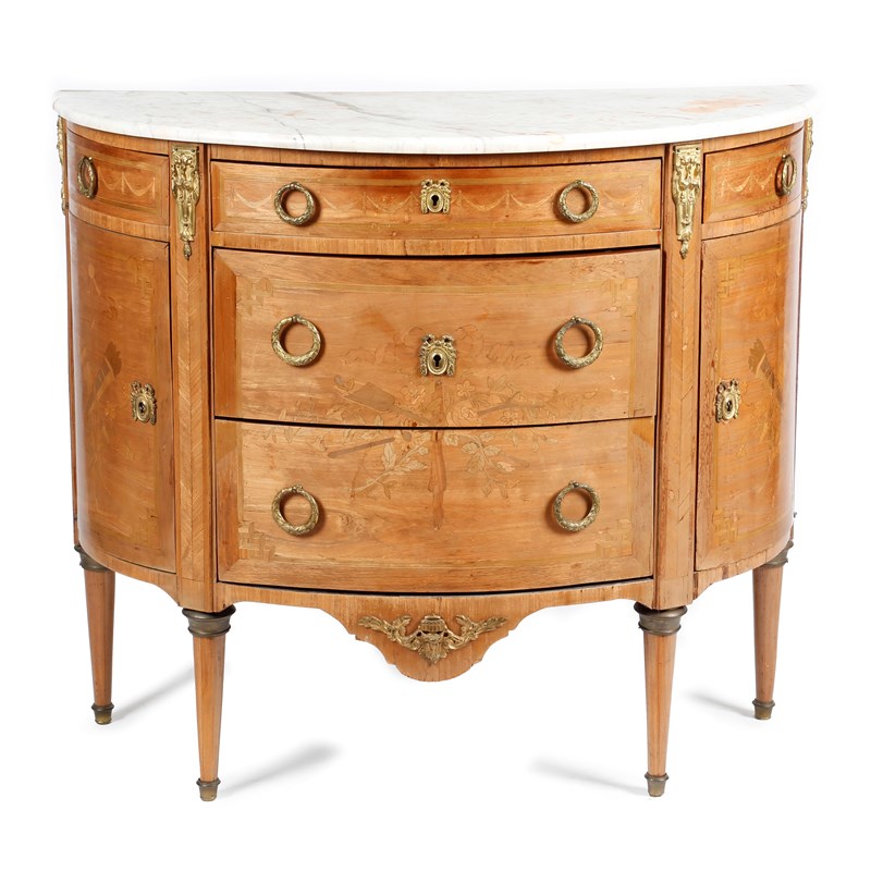 inlaid with swags and ribbon tied trophies, with gilt bronze mounts, the white marble demi-lune top above three frieze drawers, with two central drawers flanked by cupboards