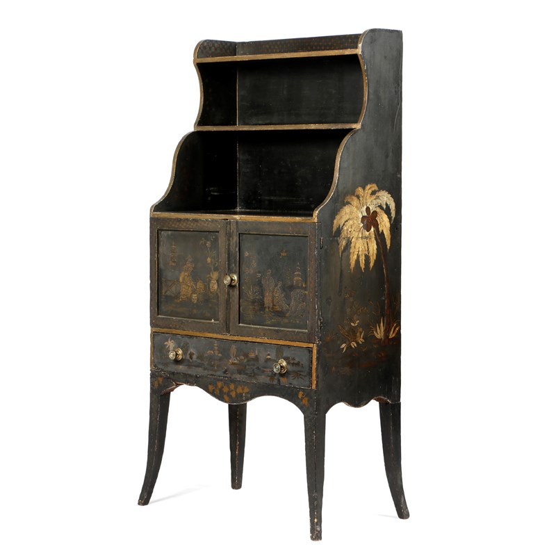 decorated with chinoiserie scenes of figures, pagodas, watery landscapes, the sides with exotic palm trees, the top with open shelves, above a pair of panelled doors and a drawer