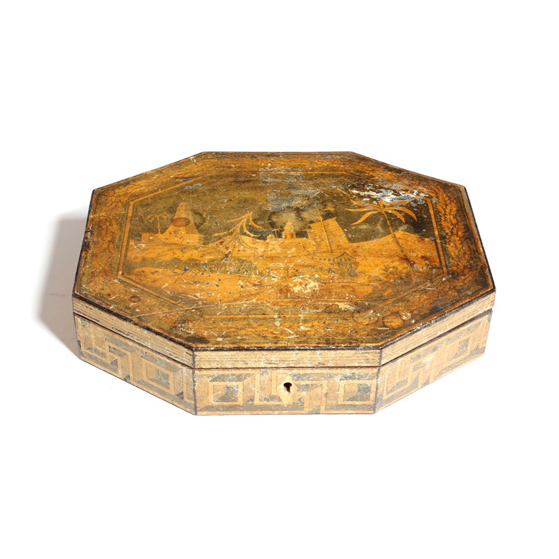 A REGENCY PENWORK OCTAGONAL BOX EARLY 19TH CENTURY the hinged lid decorated with a desert scene