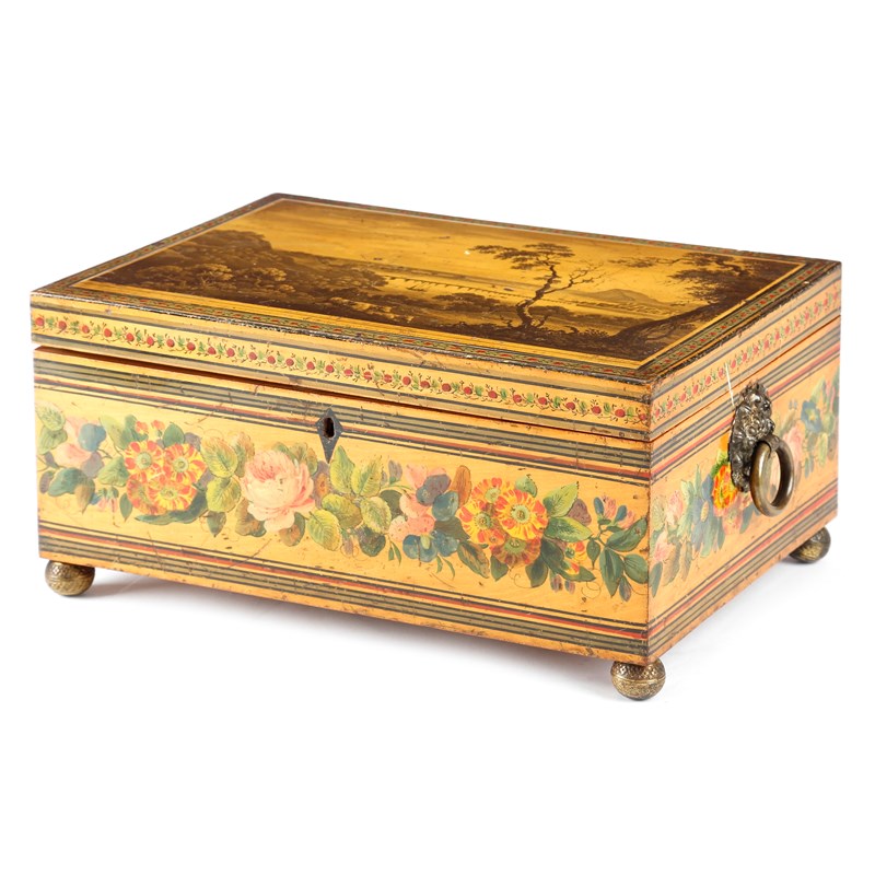 decorated overall with bands of flowers and leaves, the hinged lid with a printed scene 'View of Teignmouth Bridge from the Bishopsteignton Road' published by E. Croydon, 1827, the blue paper lined interior with a divided lift-out tray with some lidded compartments, with brass ring handles and on foliate decorated ball feet