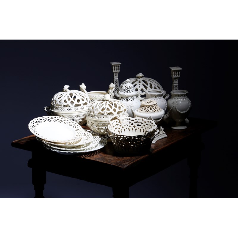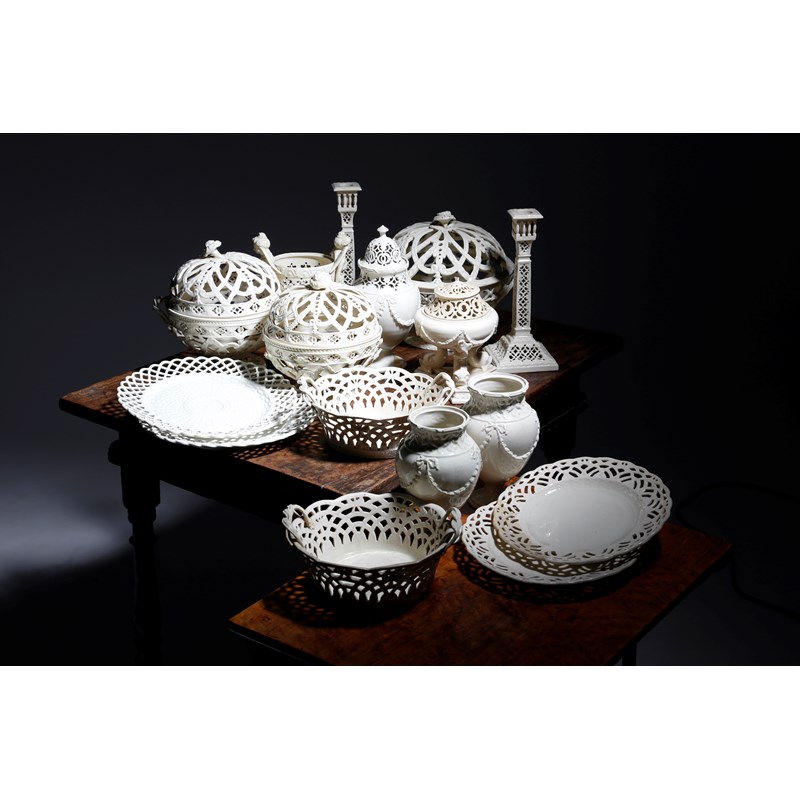 the majority by Leeds Pottery and with reticulated decoration, comprising: three chestnut baskets and covers with flower finials, a pair of open baskets with strap handles, a pair of square section candlesticks, three ovoid vases, decorated with ribbon tied swags, one with a cover, a vase and cover with dolphin supports, an ovoid vase with winged female caryatids and four plates with impressed marks 'Leeds Pottery', some with paper labels for Thomas Goode 'T. G. & Co. London' (21)
