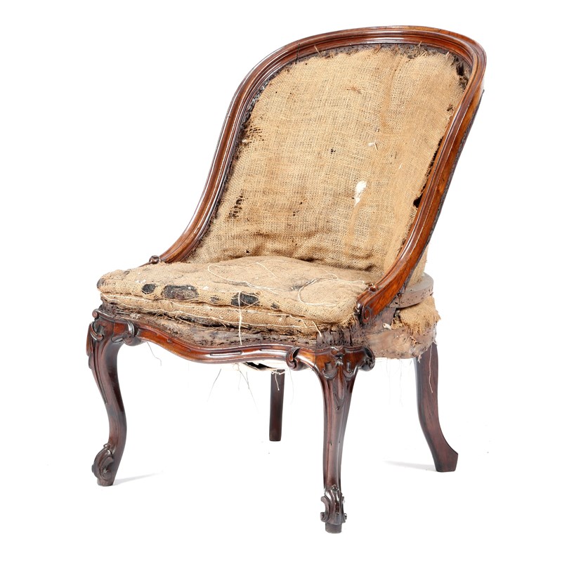 the moulded frame carved with scrolls and leaves, on cabriole front legs, in need of recovering