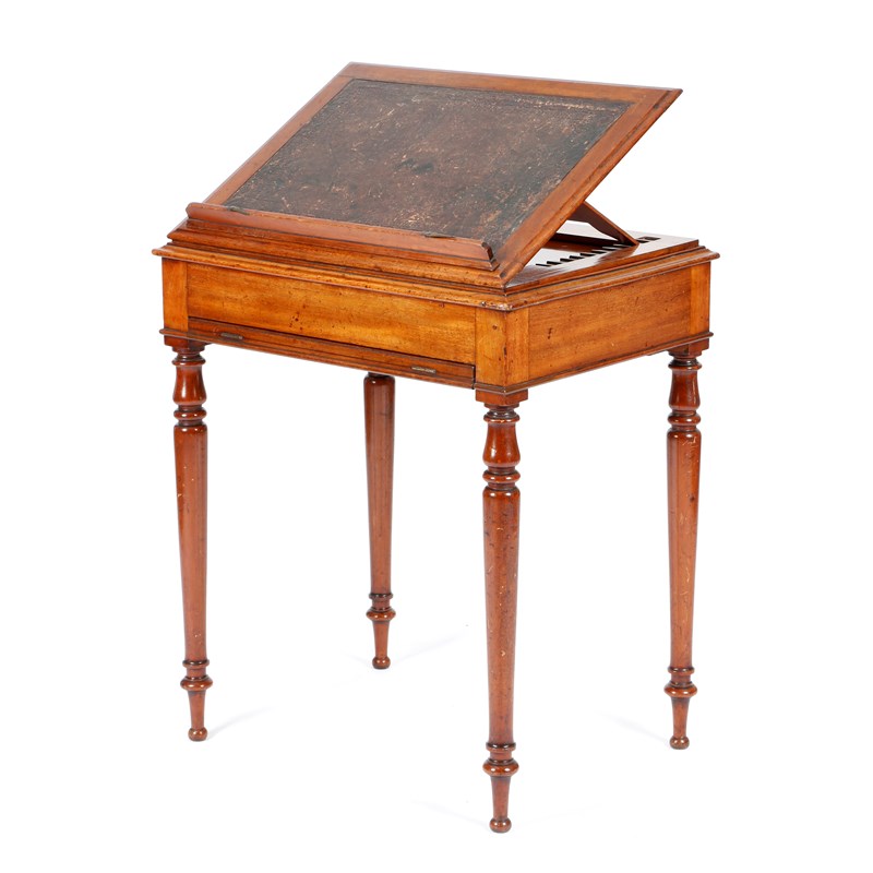 the drop-in top inset with a gilt tooled leather writing surface on a hinged ratchet and with a rest, above a raised beading, the frieze with a slide-out hinged rest, with forty-five pierced and brass mounted holes, on turned tapering legs