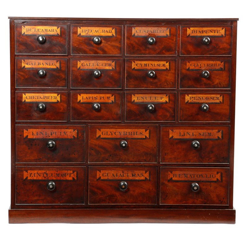 A BANK OF MAHOGANY APOTHECARY DRAWERS