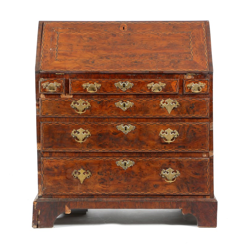 AN EARLY GEORGE III YEW BUREAU C.1760-70 inlaid with chevron stringing