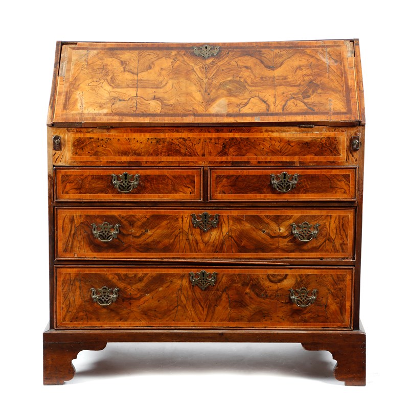 A GEORGE II WALNUT BUREAU C.1730-40 with cross and feather banding