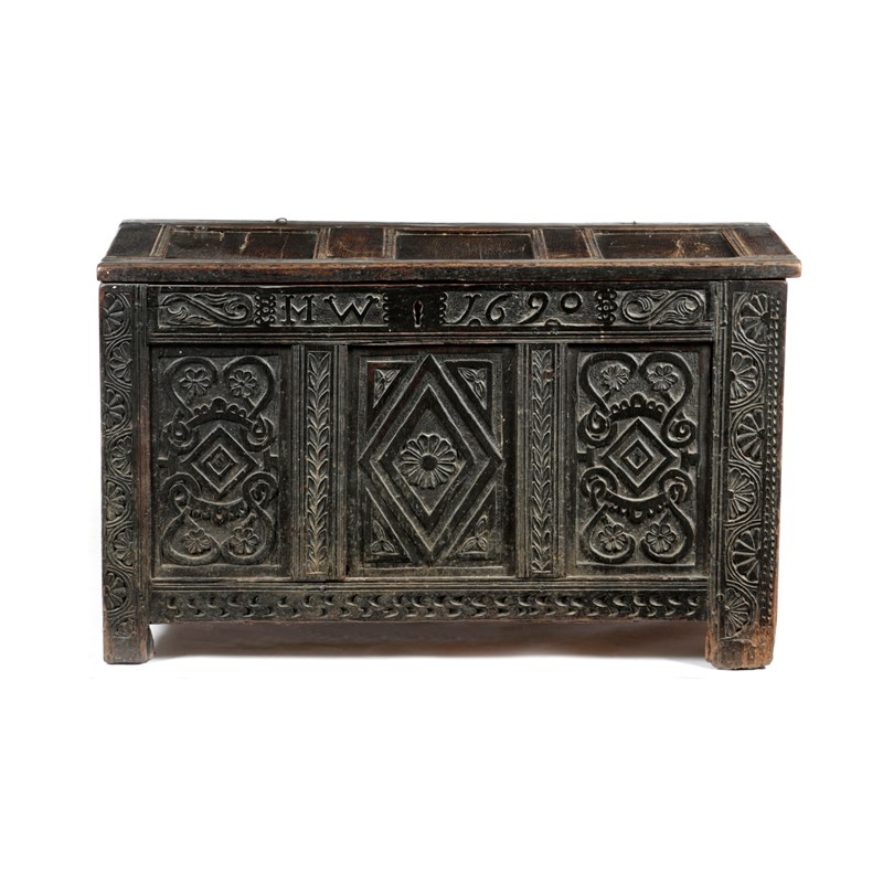 the triple panelled hinged lid revealing a vacant interior, the carved front with initials 'H W' and the date '1690', above three panels carved with lozenges, flowerheads and interlaced scrolls, the front stiles with flower lunettes