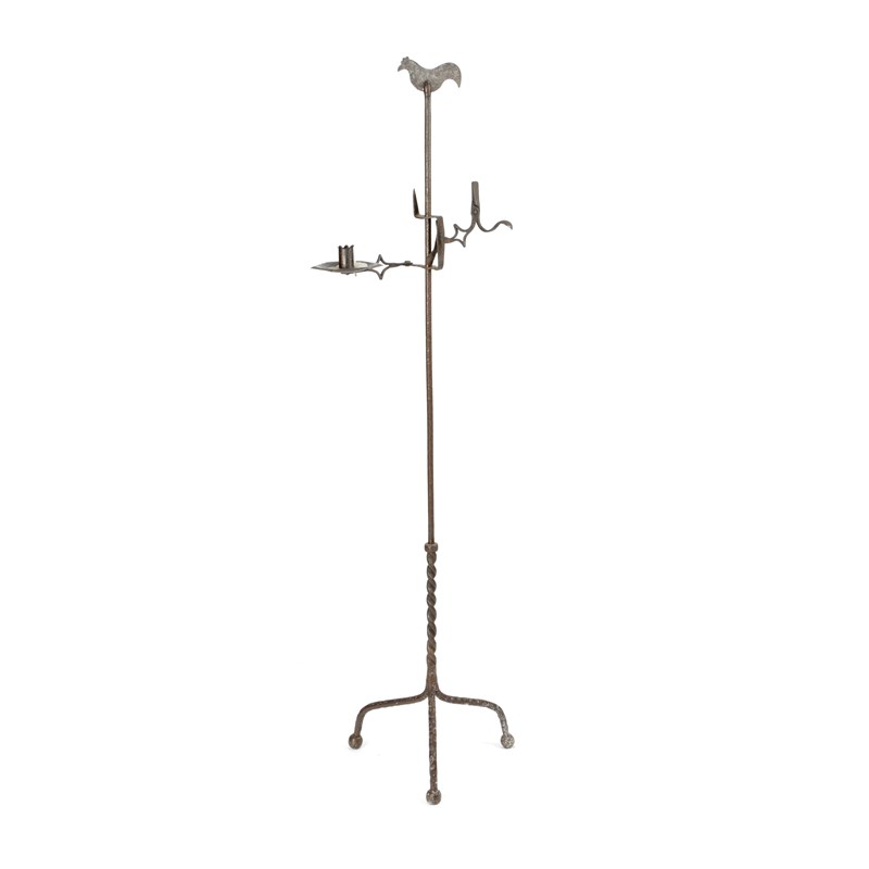 A WROUGHT IRON FLOOR STANDING ADJUSTABLE CANDLE HOLDER