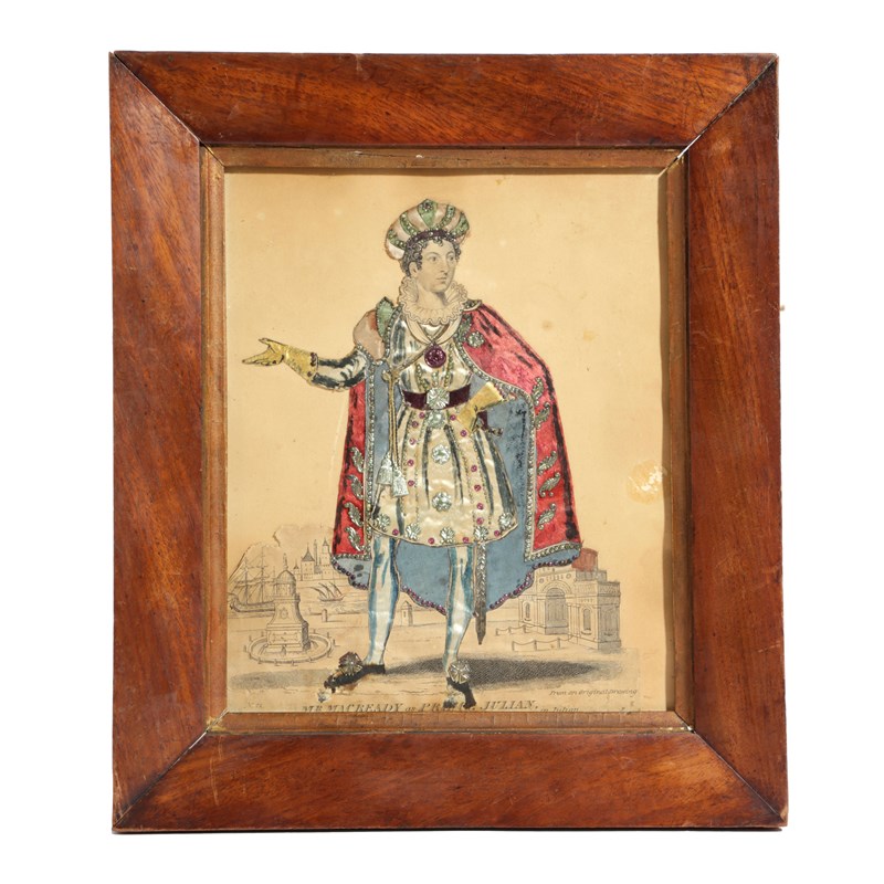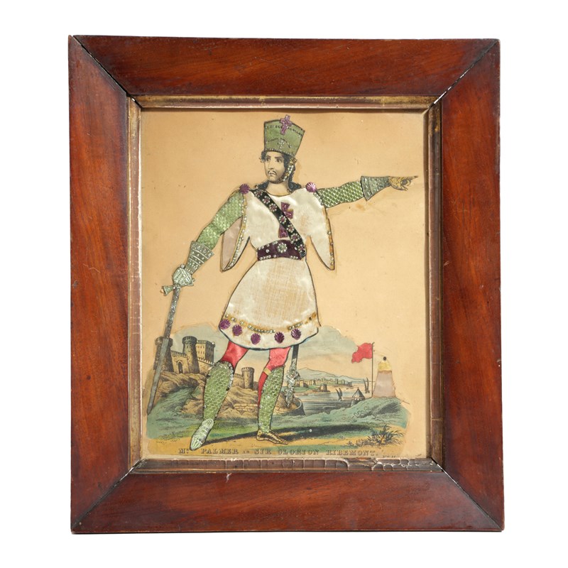 'Mr Palmer as Sir Glorion Ribemont' and 'Mr Macready as Prince Julian', hand-coloured engravings with cut-tinfoil, silk, felt and sequins, each in a glazed wood frame (2)