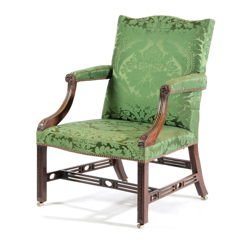 upholstered with green damask, with a serpentine padded back, with downswept arms carved with rosettes and an entrelac band terminating in shells, on conforming moulded front legs united by pierced 'Chinese Chippendale' style stretchers, on later brass castors