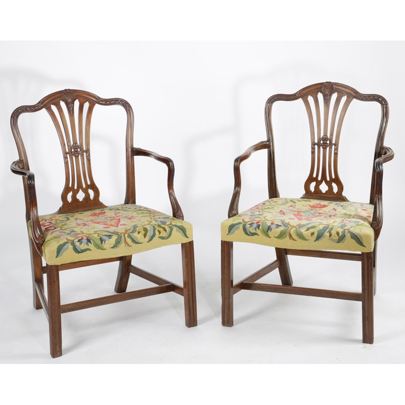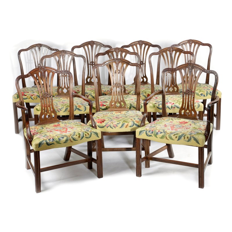 each with a serpentine top rail carved with harebells and palmettes, above a pierced vase shape splat carved with a ribbon, above a later needlework seat decorated with flowers and a coat of arms, on moulded front legs united by an 'H' stretcher, comprising: a pair of open armchairs and eight side chairs (10)