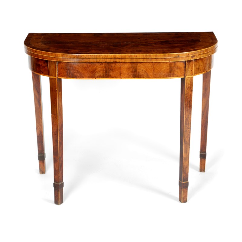 inlaid with boxwood stringing and satinwood banding, the 'D' shape crossbanded top revealing a baize lined playing surface on twin gate supports, on square tapering legs and applied ankles