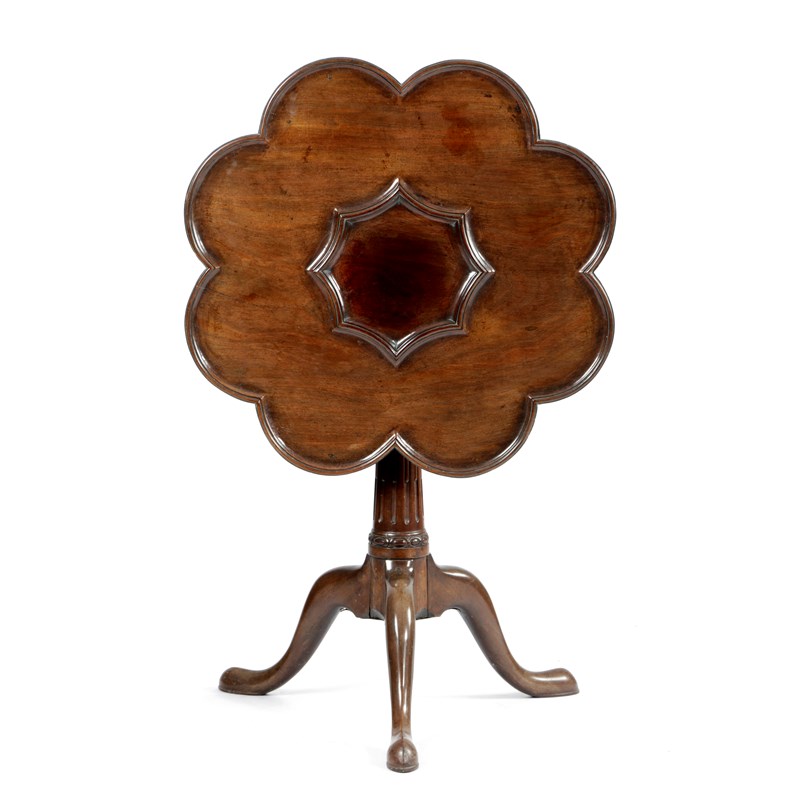 the lobed dished top revolving on a birdcage, on a stop fluted and cabochon carved stem and tripod supports