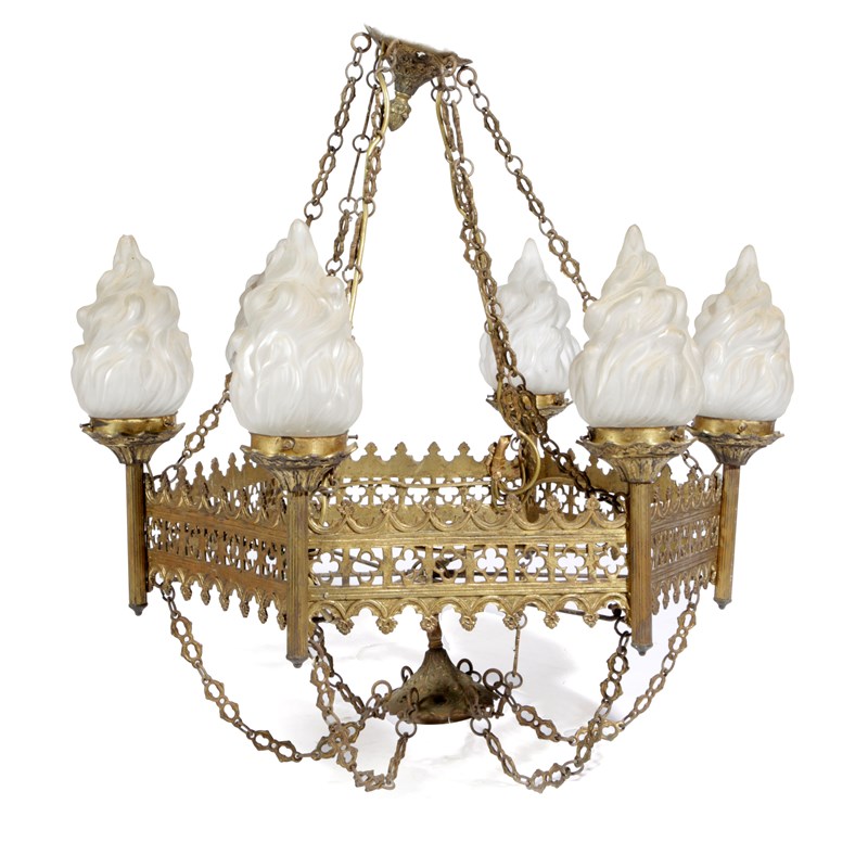 with pierced quatrefoil decoration and six torch lights with opaque glass of flaming shades, hung with chains, one chandelier with only one glass shade (2)