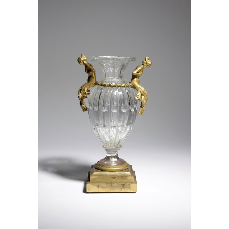 the fluted and lobed urn shape glass vase possibly by Baccarat, with twin mermaid style mounts, on a stepped base