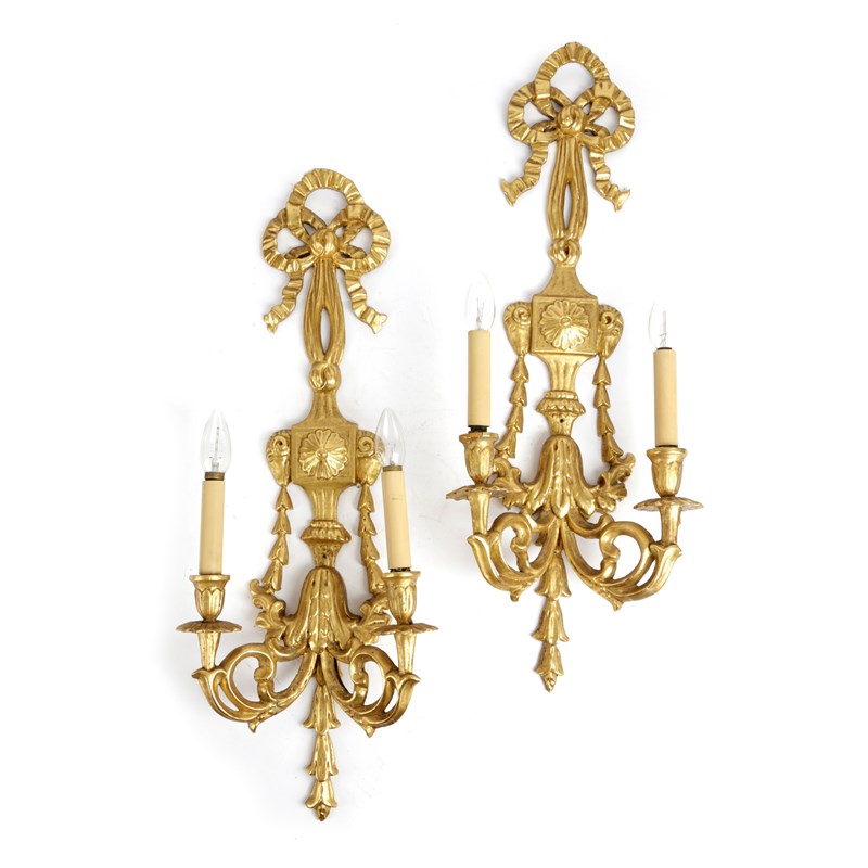 A PAIR OF GILTWOOD WALL LIGHTS IN ADAM STYLE