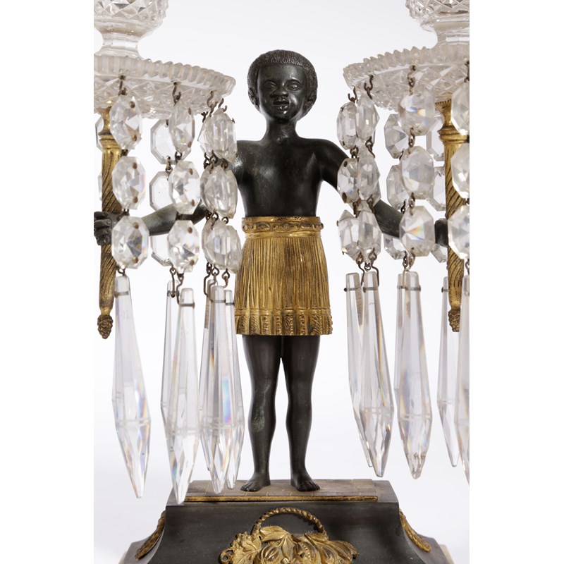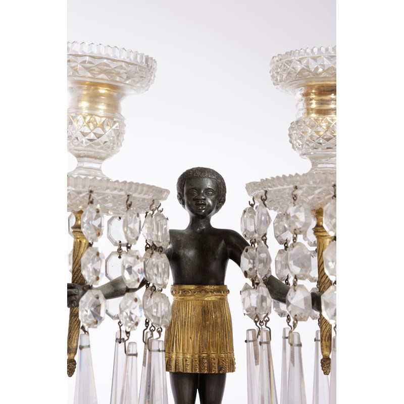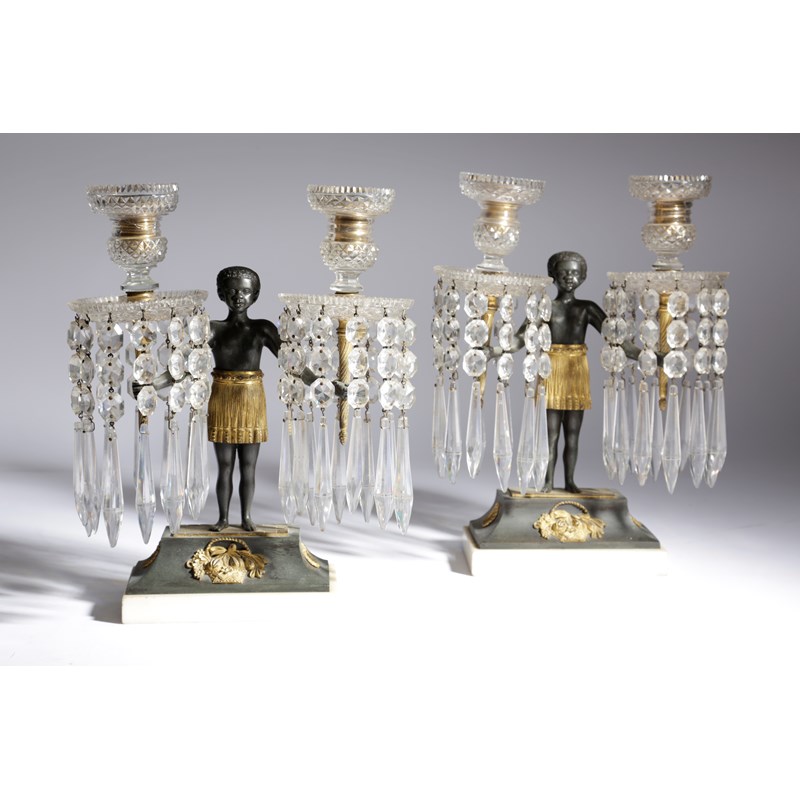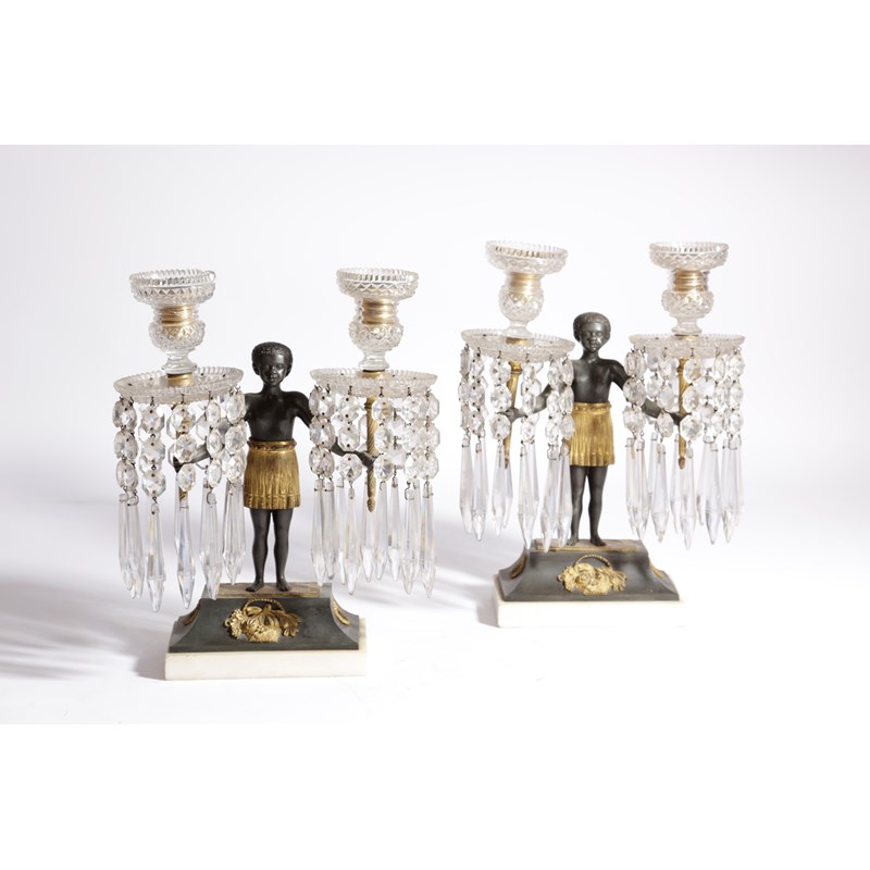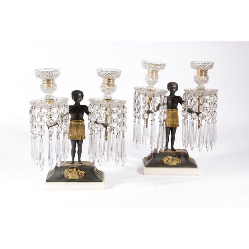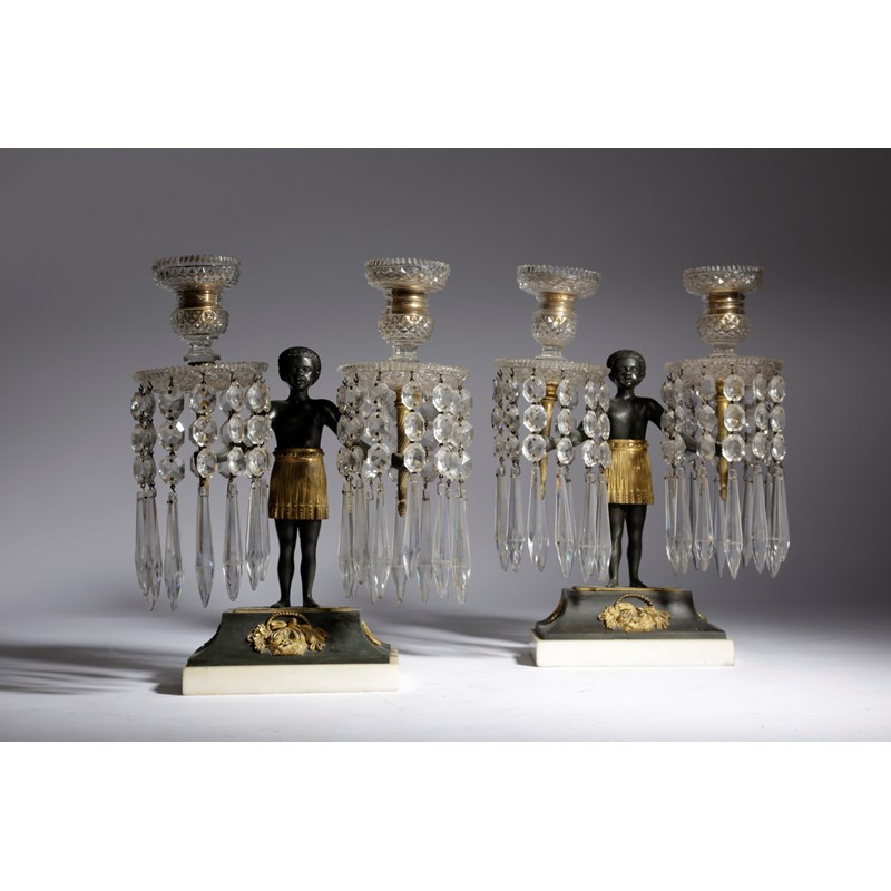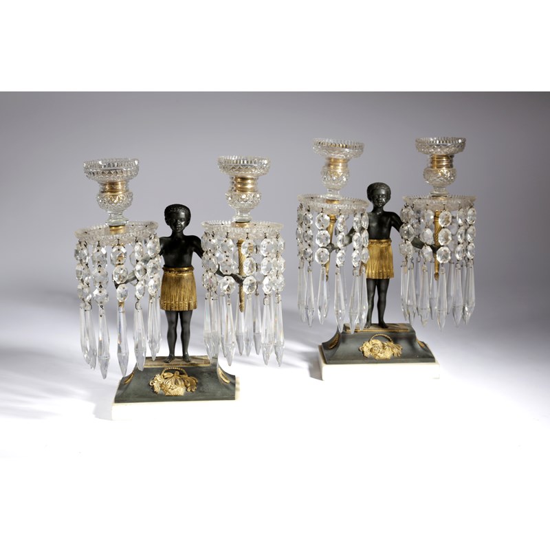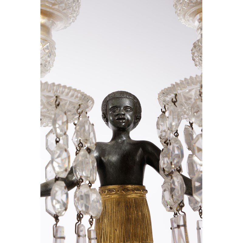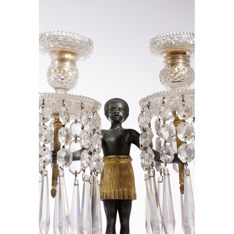 each with a standing blackamoor supporting a pair of torches, with cut-glass sconces and drip-pans, hung with faceted drops and lustres, the base decorated with a basket of fruit and flowers and two laurel leaves, on a marble plinth (2)