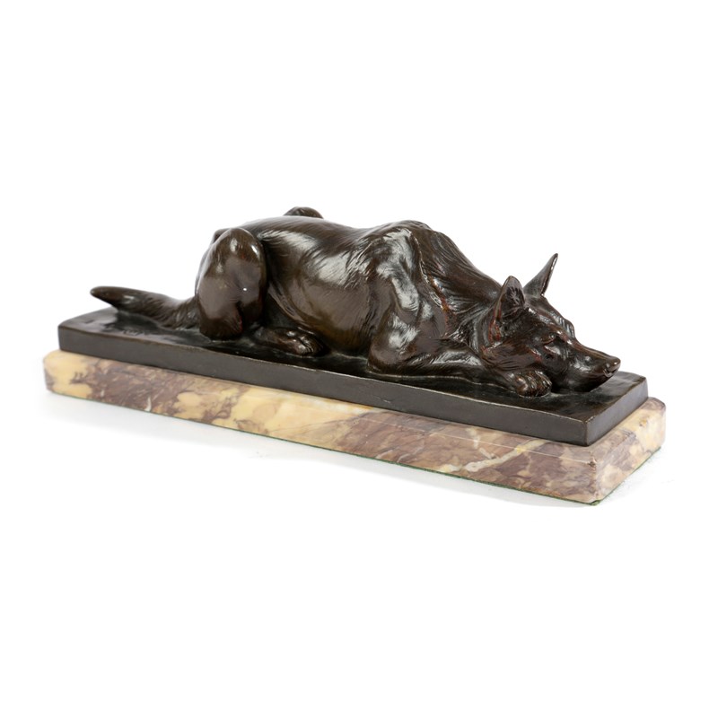 A FRENCH BRONZE ANIMALIER FIGURE OF A RECUMBENT ALSATIAN DOG