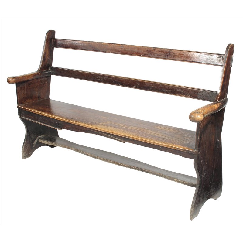 A 19th century pine and elm pew bench, 39¼in (99.5cm) high, 62½in (158.6cm) wide, 15¾in (40cm) deep.