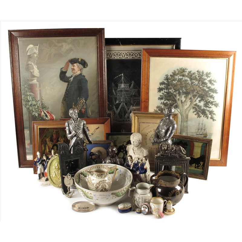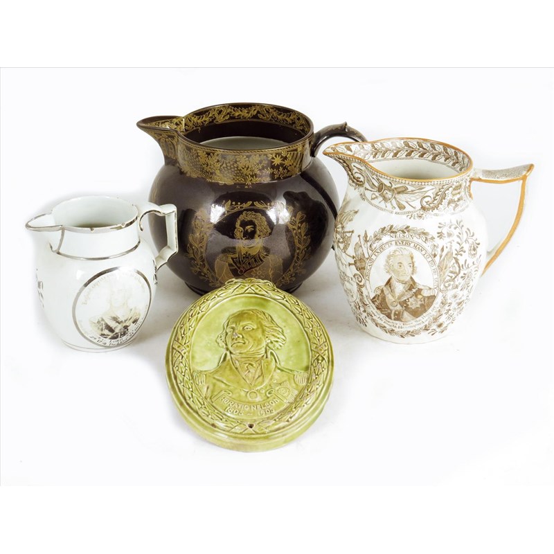 Nelson interest. An early 19th century brown glazed pearlware jug, printed with portraits of Lord Nelson and Lord Collingwood, 5¾in (14.3cm) high, 8in (20.2cm) wide, a pearlware and silver lustre jug, printed with a bust of Lord Nelson, the reverse with a list of the fleet, with the number of guns, a moulded pearlware jug and a green glazed oval plaque. (4)
