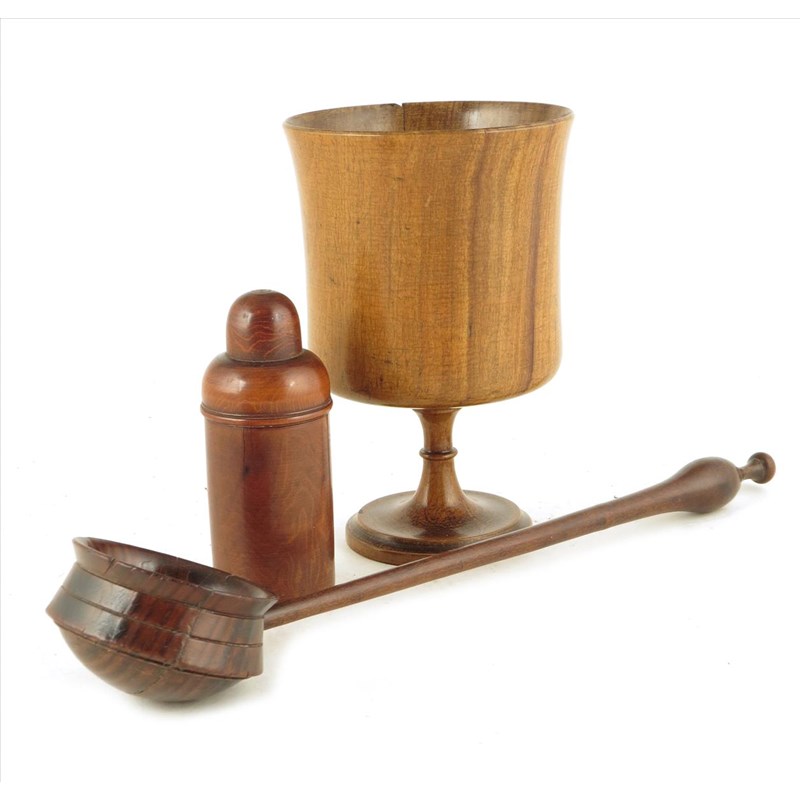 A turned fruitwood goblet, 6½in (16.5cm) high, an 18th century turned lignum vitae and alder ladle, 13in (33cm) long, a 19th century turned sycamore bottle case, 4¼in (10.8cm) high. (3)