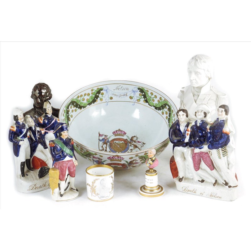 Nelson interest. A 19th century brown glazed and silver lustre pottery bust of Lord Nelson, 8¾in (22cm) high, a parian bust of Nelson after John Flaxman, the reverse impressed 'R & L' for Robinson and Leadbetter; a Derby porcelain bust of Nelson, the base with his dates; three Staffordshire pottery models, two titled 'Death of Nelson'; a Samson bowl in the Nelson Service pattern and a porcelain mug with an applied bisque bust of Wellington, titled. (8)