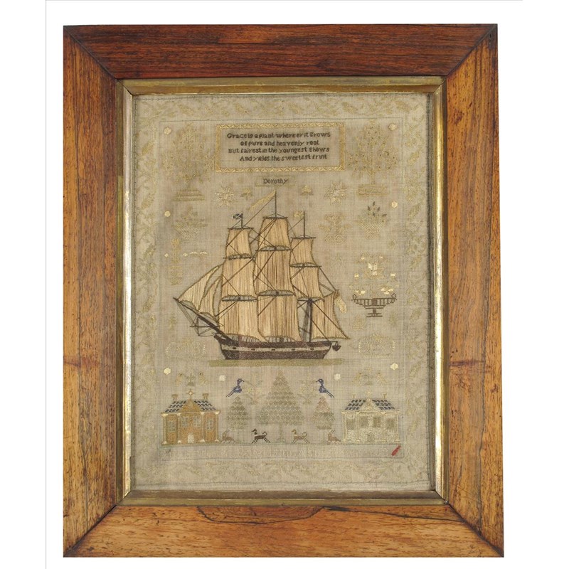 ‡An early 19th century needlework sampler, worked a verse, a three masted ship 'Dorothy,' flowers, 'T.D', 'M.D' column fronted houses, trees, animals and birds, 'Anstruther Davidson, Aged 7 Years 18..,' 15¼ x 11½in (38.6 x 29.2cm) in a later rosewood frame.