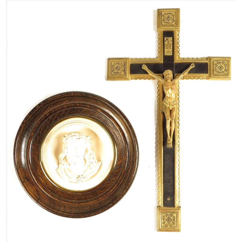 A German ormolu crucifix, 11½in (29cm) high, a relief rondel, bust of Jesus, inscribed 'DOGONPALE,' in an oak frame, 6¼in (16cm) diameter. (2)