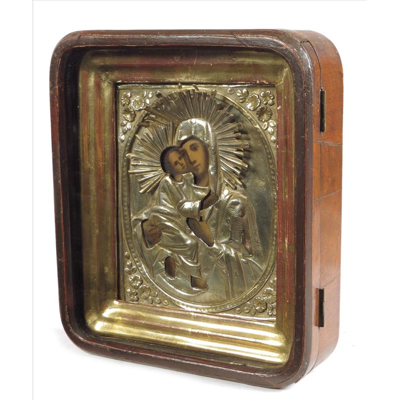 An Orthodox icon, painted the Madonna and child, with embossed silver coloured metal mount, in a walnut case with glazed hinged door, 10 x 8½in (25.5 x 21.5cm).